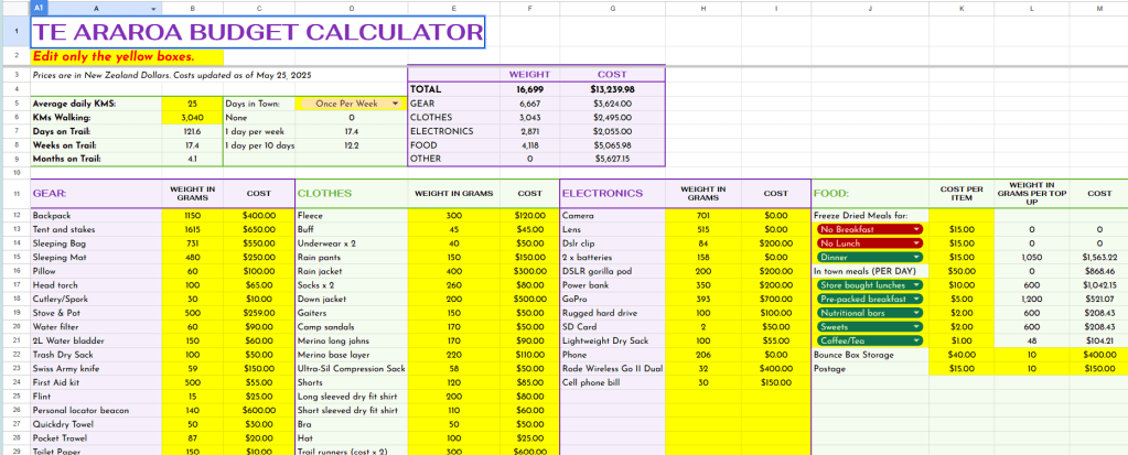 - Download the Te Araroa Budget Calculator